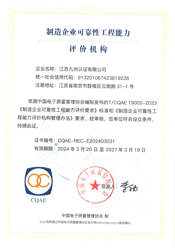 制造企業(yè)可靠性工程能力評價(jià)機(jī)構(gòu)證書