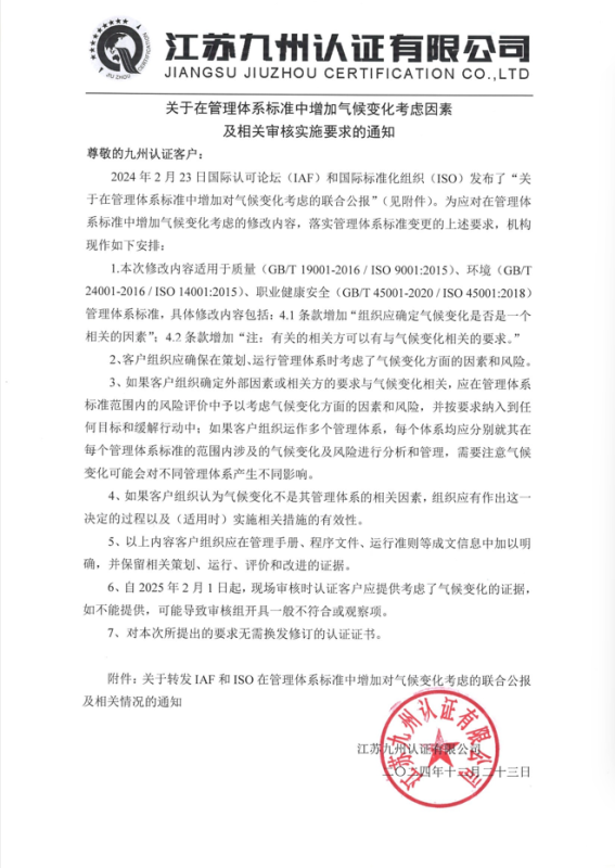 附件:關(guān)于轉(zhuǎn)發(fā)IAF和ISO在管理體系標(biāo)準(zhǔn)中增加對(duì)氣候變化考慮的聯(lián)合公報(bào)及相關(guān)情況的通知
